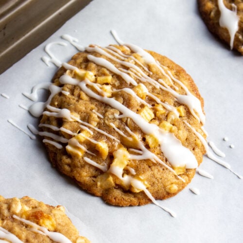 These soft Apple Oatmeal Cookies are loaded with tiny chunks of sweet apples and full of warm spices. They are topped with a simple sweet glaze and are the best cookie for fall.