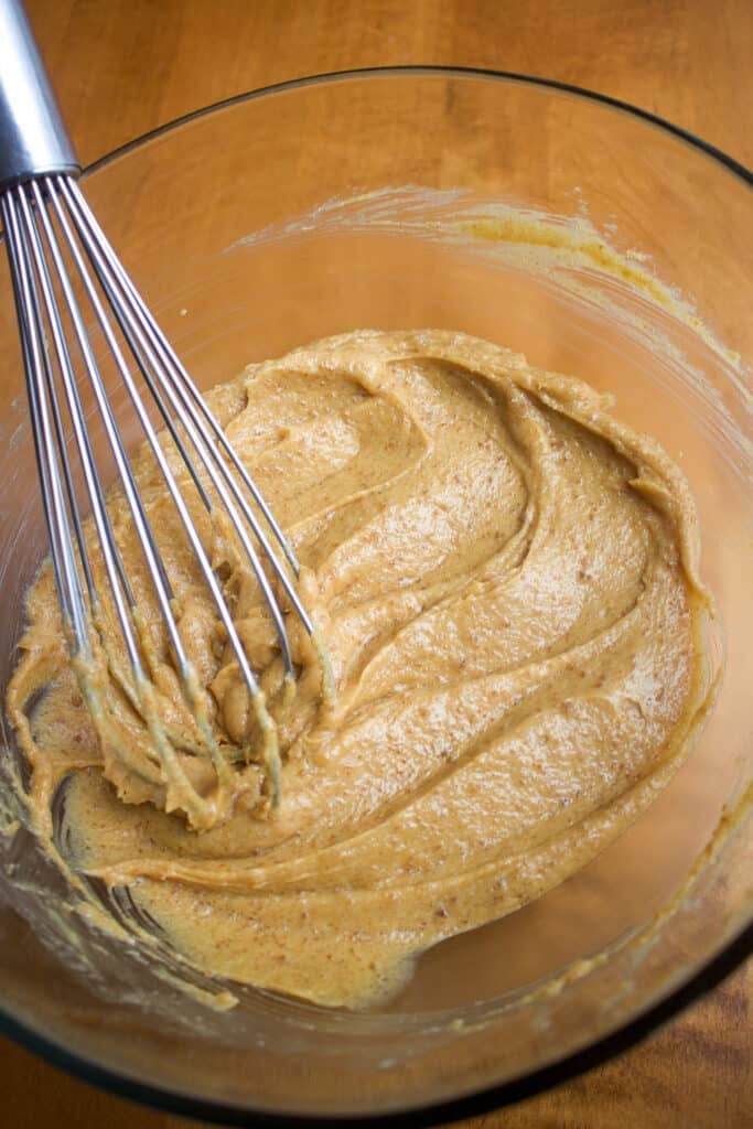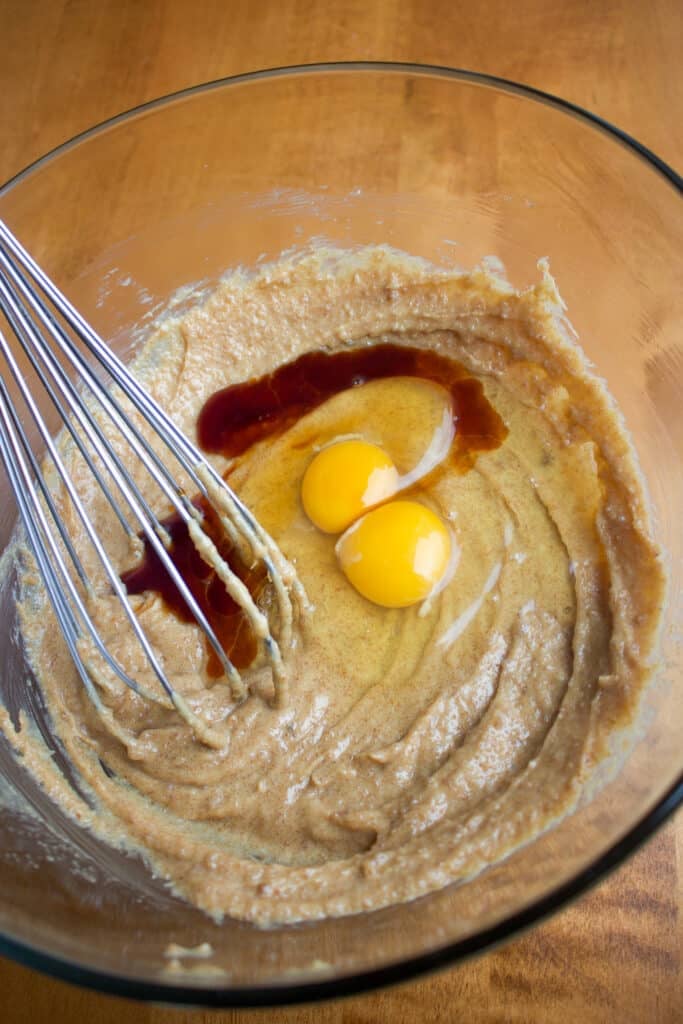 Step 4: Add in wet ingredients. Whisk in the peanut butter, then add in the eggs and vanilla.