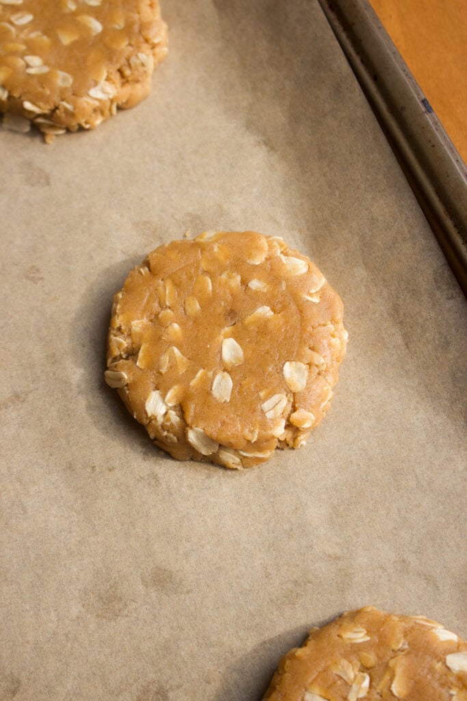 - Scoop 6 cookies at a time per tray, evenly spacing them apart from one another. Gently press the cookies and flatten them down (see photo above for reference) to get better spreading.