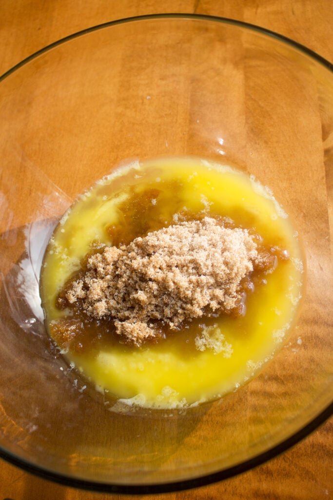 - In another bowl, add the butter (can be warm), oil, brown sugar, and white sugar. Whisk well to combine (2-3 minutes).3/4 cups unsalted butter, 2 tbsp oil, 1/2 cup dark brown sugar, 1/2 cup white sugar
