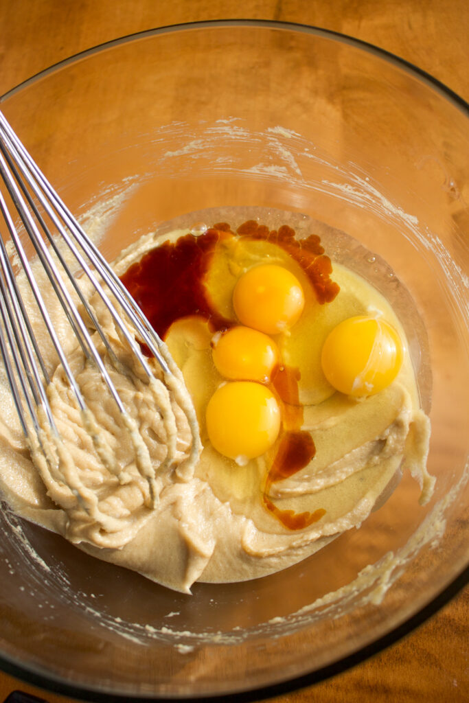 Step 3: Add in eggs and vanilla. Whisk in the eggs, yolk, and vanilla until well combined.