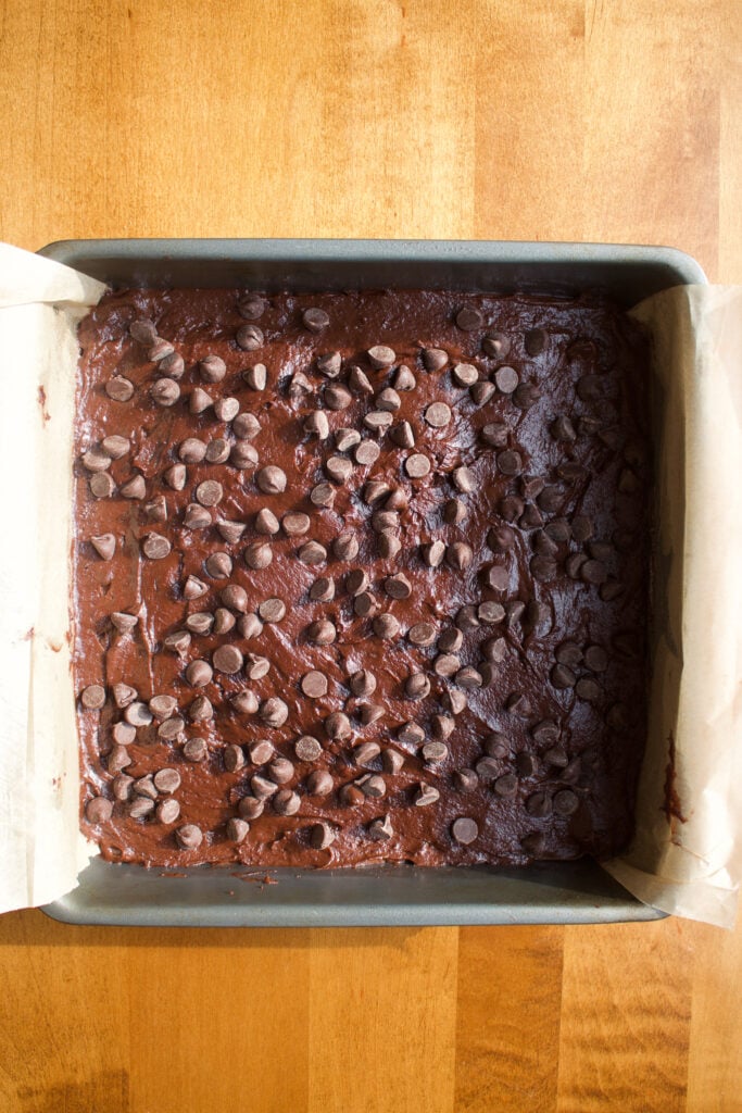 Step 6: Transfer and bake. Spread evenly in the pan and sprinkle extra chocolate chips on top. Bake for 25-30 minutes or until a toothpick inserted in the middle is fudgy, but not raw with batter.
