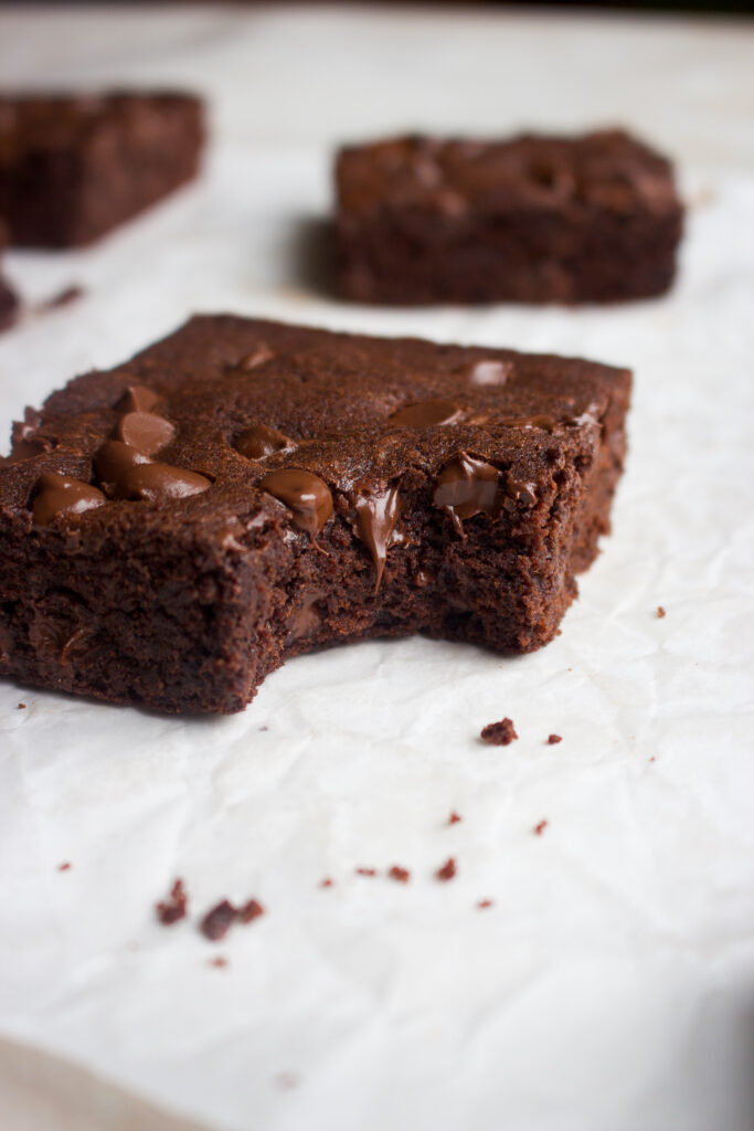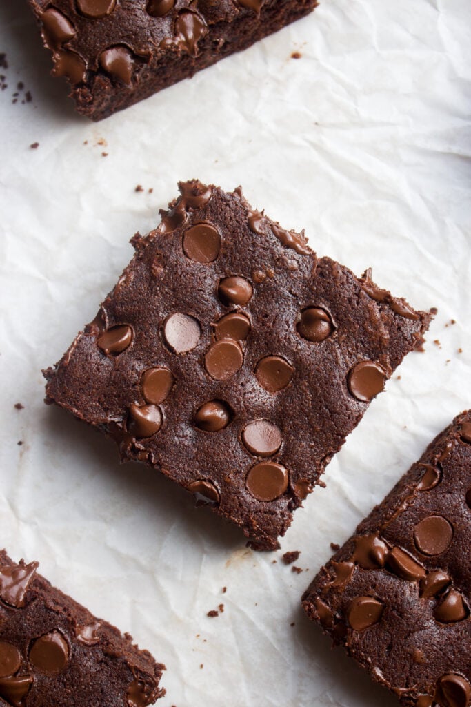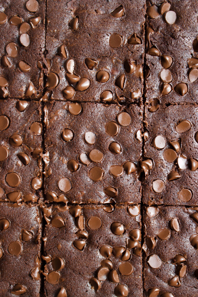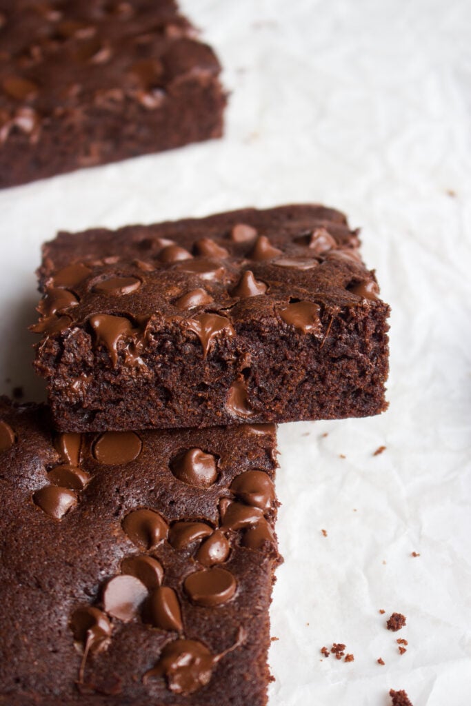 These bars come together in one bowl with a few simple ingredients. They are soft and gooey in the middle, are made with lots of cocoa powder, and loaded with melty chocolate chips.