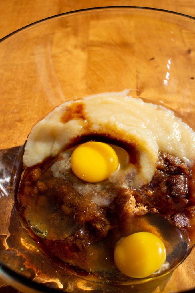 - In another large bowl, add the applesauce, brown sugar, white sugar, eggs, vanilla, and oil. Whisk for 1-2 minutes until smooth.1/2 cup oil, 2/3 cups unsweetened applesauce, 1 tbsp vanilla, 2 large eggs, 1/2 cup dark brown sugar, 1/2 cup white sugar