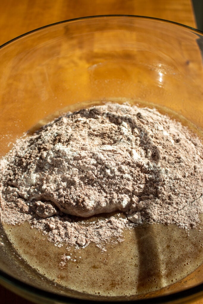Step 2 – Mix dry ingredients. In a medium sized bowl, add in flour, sifted cocoa powder, cinnamon, nutmeg cloves, cornstarch, baking powder, baking soda, and salt. Stir to combine and set aside.