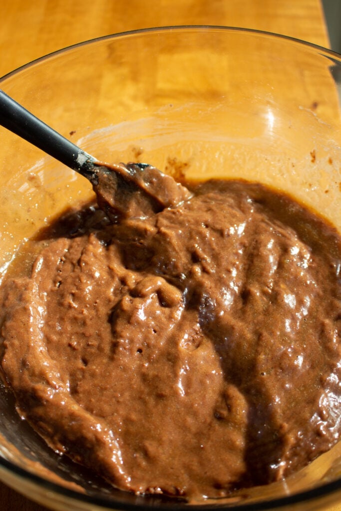 - Combine the dry and wet ingredients together until a soft cake batter forms. Do not over-mix!