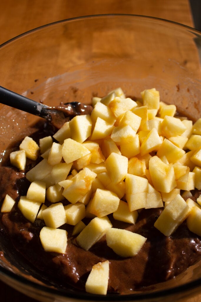 - Mix in the chopped apples a few times until well distributed amongst the batter, once again, do not over-mix!2 medium-sized apples