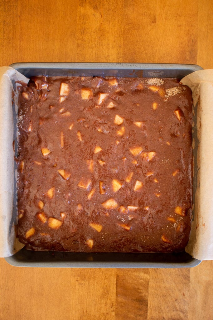 - Transfer into the prepared pan and spread evenly. Sprinkle cinnamon sugar topping on top for a sweet top (optional).