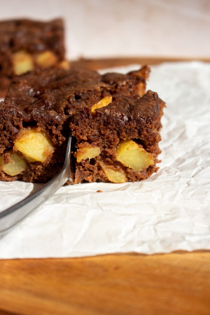 Here is how to make and bake this Chocolate Apple Cake. You will need a 9×9 baking pan lined with parchment paper, 3 bowls, a spatula, and a whisk.