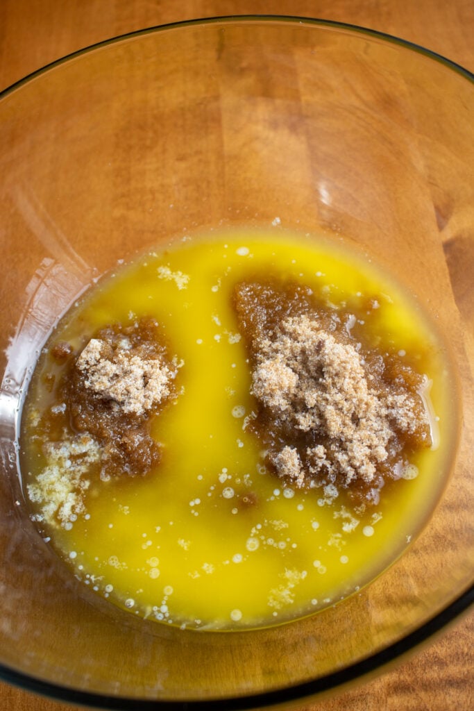- In another large bowl, add the melted and cooled butter, brown sugar, and white sugar. Whisk to combine and set aside.3/4 cups dark brown sugar, 1/2 cup white sugar, 1 cup unsalted butter