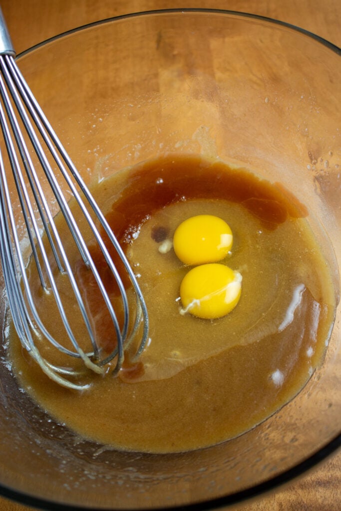 - Add in the eggs and vanilla and continue whisking until smooth.2 large eggs, 1 tbsp vanilla