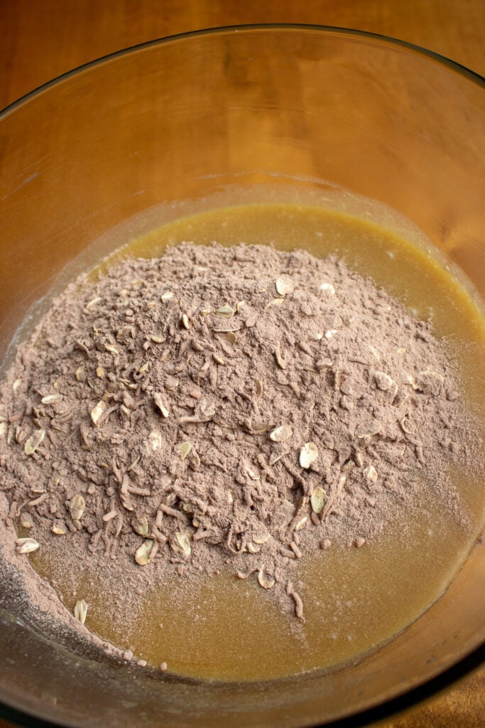 Step 1 - Mix dry ingredients. In a medium-sized bowl, add in flour, sifted cocoa, oats, shredded coconut, baking soda, baking powder, cinnamon, cornstarch, and salt. Stir to combine and set aside.