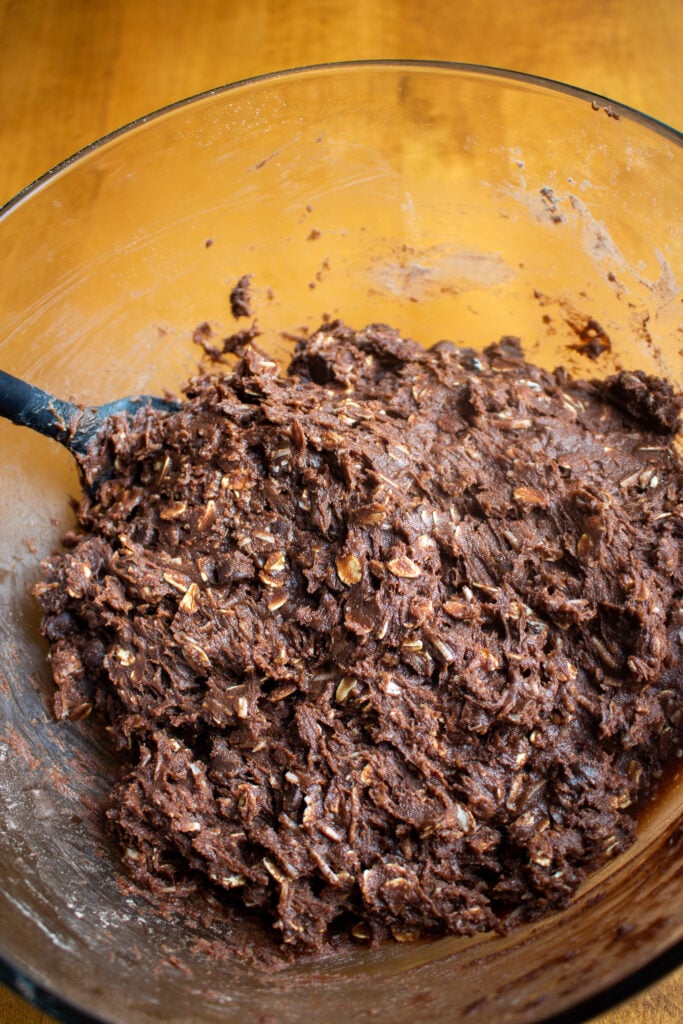 - In a bowl, add the flour, oats, cocoa powder, shredded coconut, baking soda, baking powder, cornstarch, cinnamon, and salt. Stir to combine and set aside.1/4 tsp cinnamon, 1 tsp baking soda, 1/2 tsp baking powder, 1/3 cup cocoa powder, 1 1/4 cups rolled oats, 1 cup unsweetened shredded coconut, 1 3/4 cups all-purpose flour, 1 tsp cornstarch