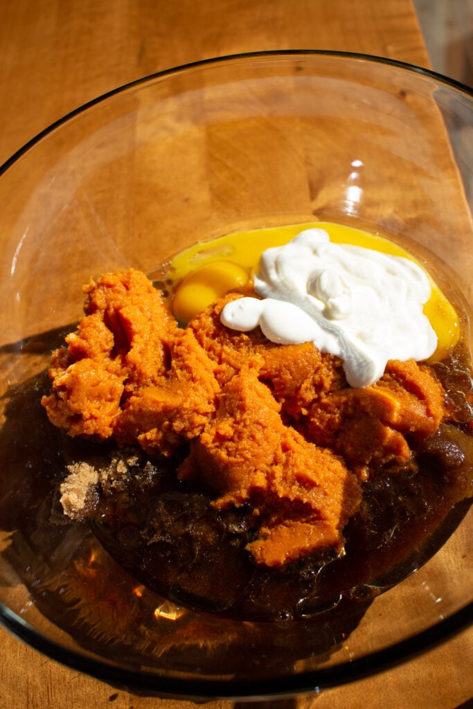 - In another large bowl, add in the eggs, pumpkin, brown sugar, white sugar, vanilla, orange zest (optional), and sour cream. Whisk together until well combined (about 1-2 minutes).3/4 cups dark brown sugar, 1/4 cup white sugar, 2 tsp orange zest, 2 large eggs, 1 tbsp vanilla, 2/3 cups oil, 1 1/4 cups pumpkin puree, 1/2 cup sour cream