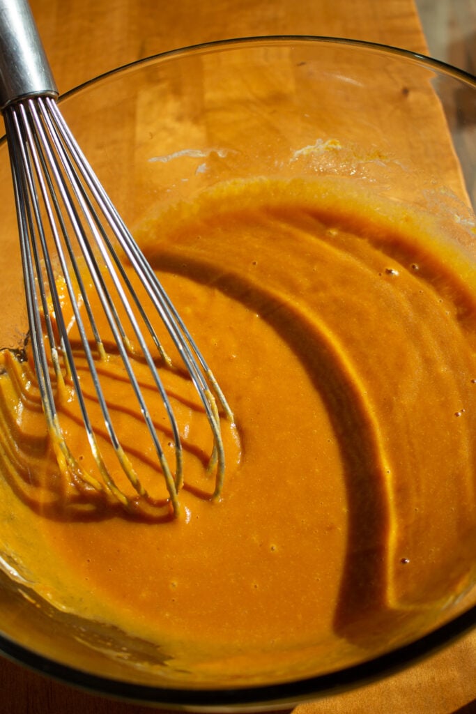 Step 2: Whisk wet ingredients. In a large bowl, add brown sugar, white sugar, pumpkin, oil, eggs, vanilla, orange zest (optional), and sour cream. Whisk together until well combined (1-2 minutes.