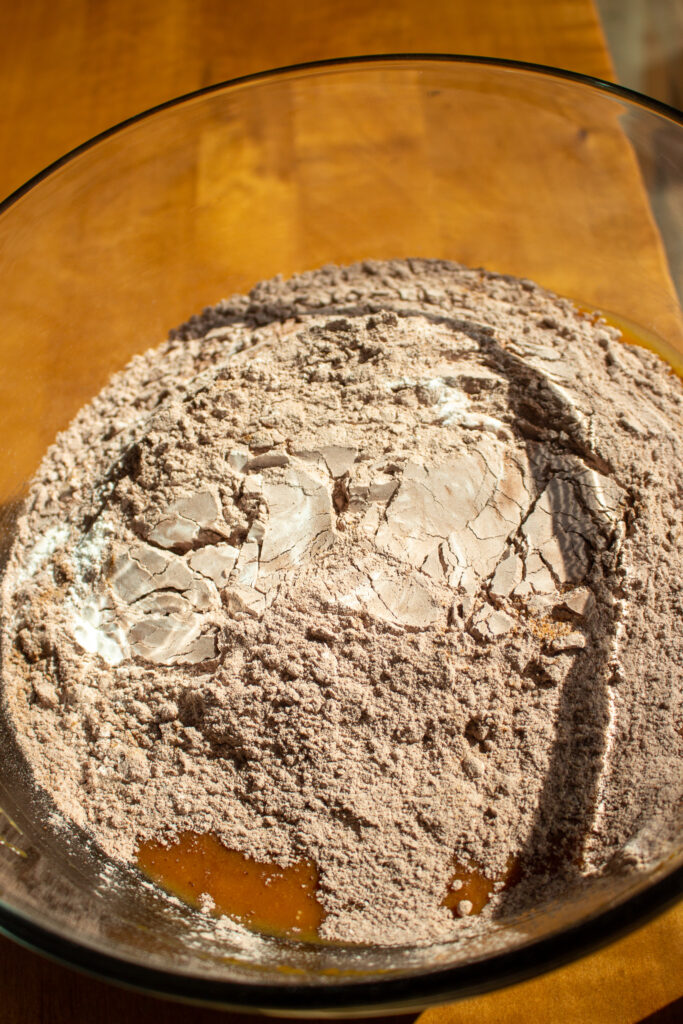 Step 1: Mix dry ingredients. In a bowl, add flour, cocoa, baking soda, baking powder, cornstarch, cinnamon, pumpkin spice, and salt. Stir to combine and set aside.