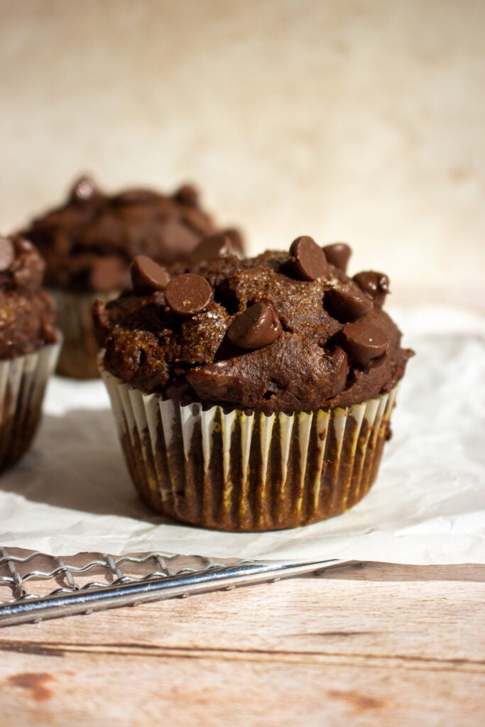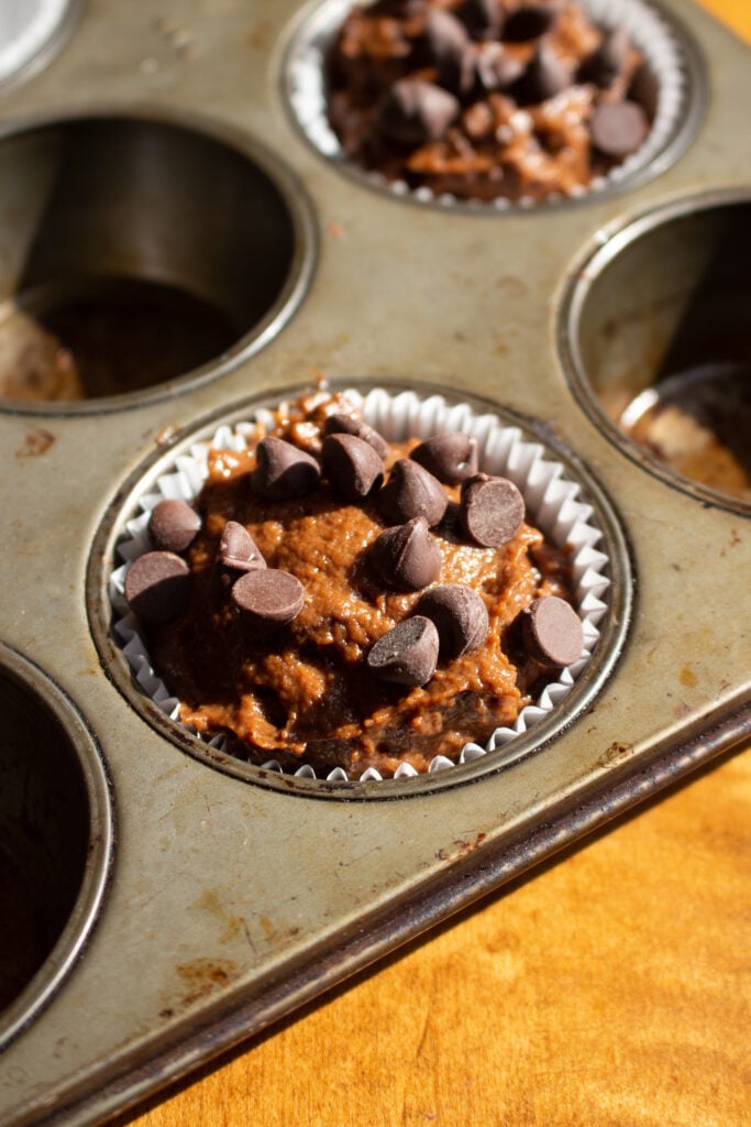 - Scoop evenly between the muffin liners, filling them all the way to the top. Sprinkle extra chocolate chips and white sugar on top (optional).
