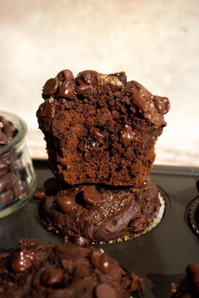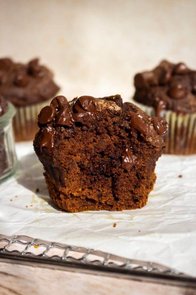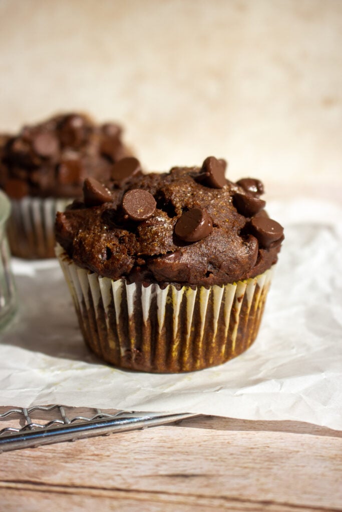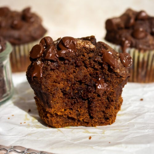 Chocolate Pumpkin Muffins combine the best fall flavours with chocolate. This easy pumpkin muffin recipe comes together in one bowl and requires no electric mixer. They are moist and super soft muffins. Every bite is full of warm spices, cocoa, pumpkin spice, and tons of gooey chocolate!