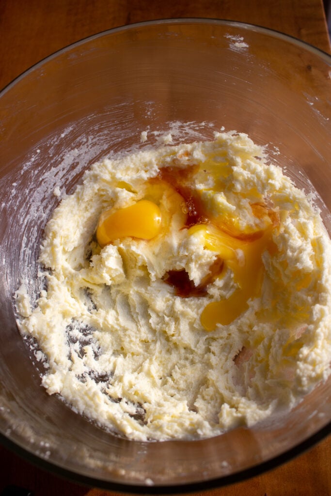 Step 3: Add in eggs and vanilla. Beat in the egg, yolk, and vanilla until well combined, about another minute or so.