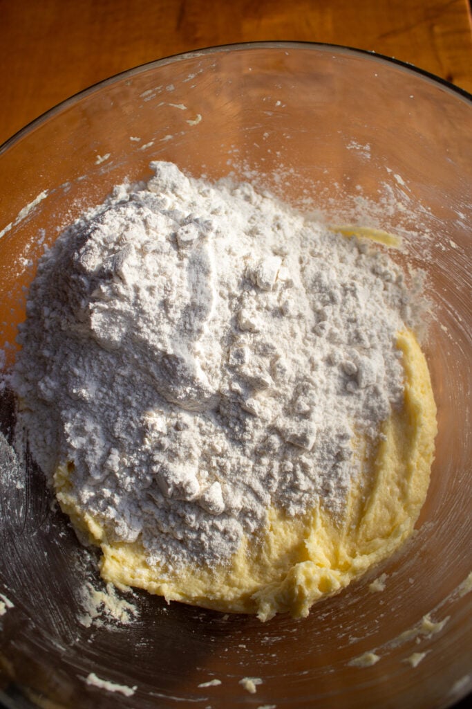 Step 2: Cream butter and sugar. In a large bowl, add the softened butter and sugar. Cream for 3-4 minutes until light and fluffy, scraping the bowl as needed.
