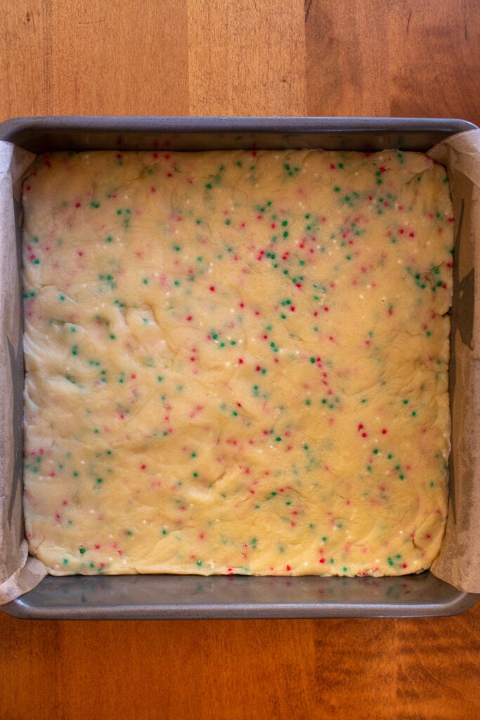 - Transfer into the prepared pan and spread evenly. I find the best way to spread the cookie dough evenly in the pan is with my fingers.