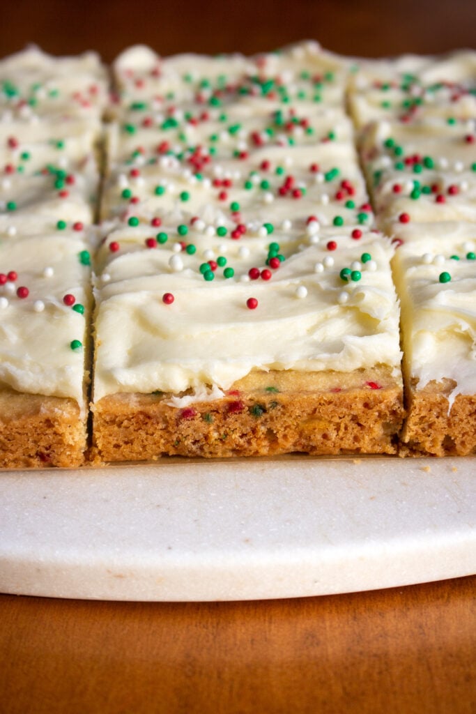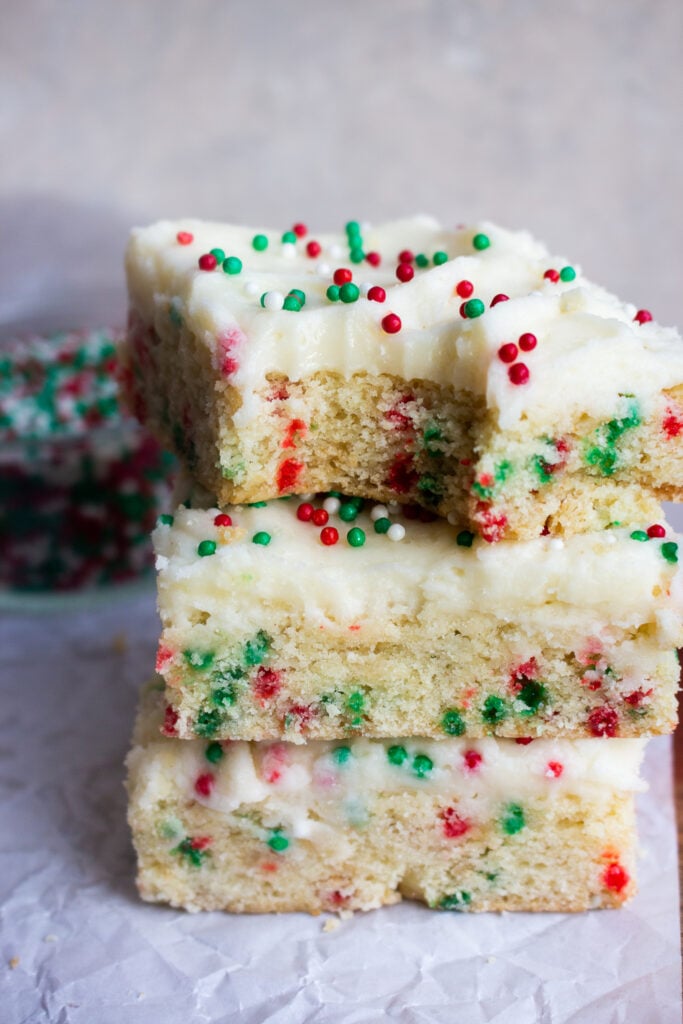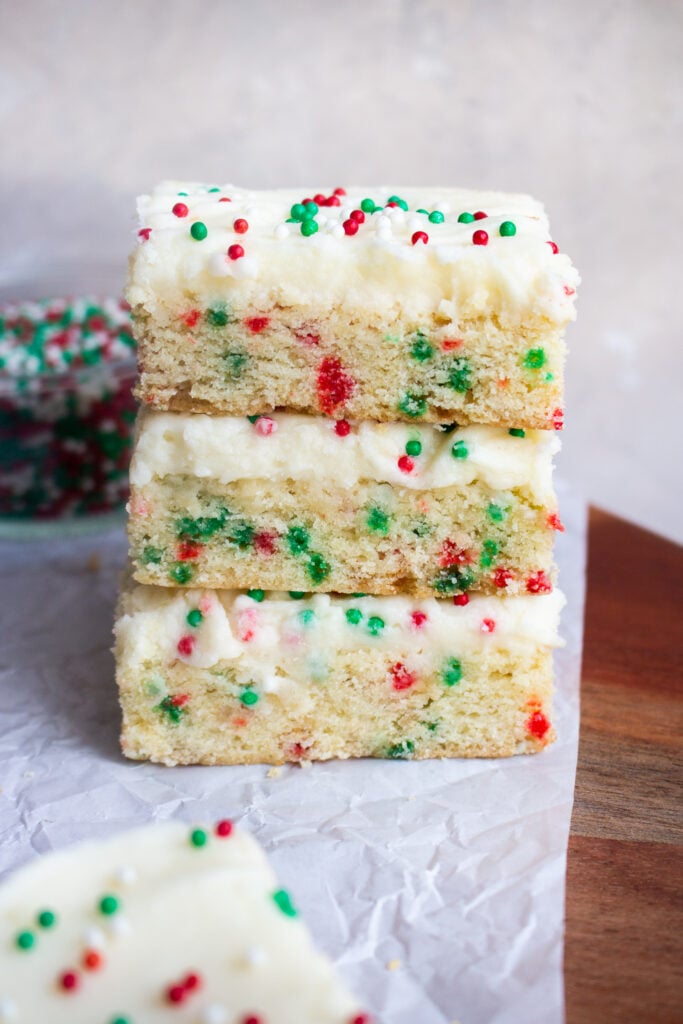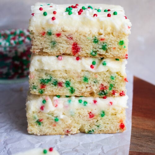 These homemade Sugar Cookie Bars are not only festive but also so delicious! They have a classic sugar cookie base, with Christmas sprinkles throughout. The vanilla buttercream frosting is so creamy and smooth, it melts in every bite.