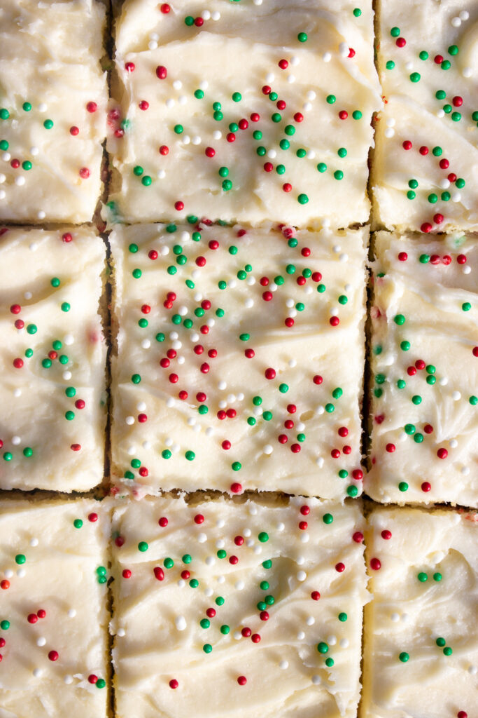 These sugar cookie bars are soft and chewy with hints of sweet sugar and vanilla. They are perfect for any Christmas cookie exchanges, holiday parties, and simple family gatherings this season.