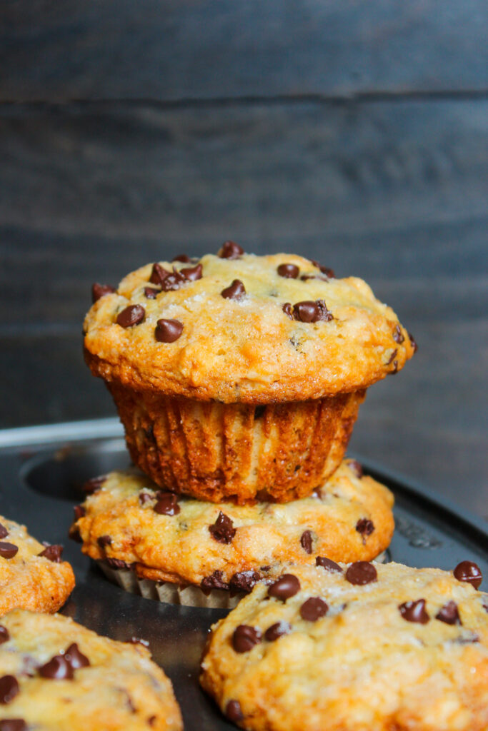 This recipe has everything you love in a muffin and more! These are fluffy, soft, chocolate chip muffins. They have sugar sprinkled on top before baking for that perfect crisp muffin top.