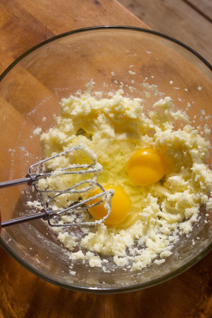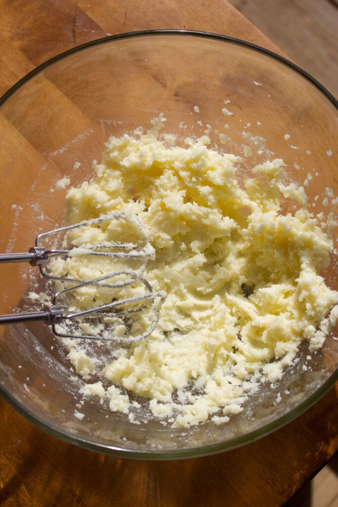 Step 3: Cream butter and sugar. With an electric mixer, cream together the softened butter and white sugar, scraping the bowl as needed, for about 2-3 minutes or until it turns pale and fluffy.