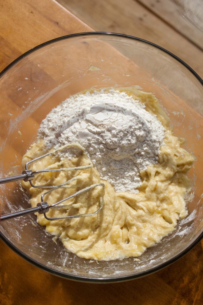 Step 5: Alternate bananas and dry ingredients. Starting with the flour, add it in three additions, alternating with the bananas in between each time (flour, bananas, flour, bananas, flour). Mix until just combined to avoid over-mixing. You can fold in the final addition of flour with a spatula if desired.