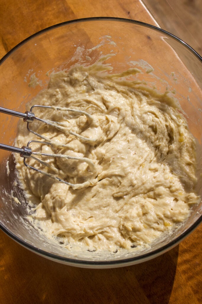 - Starting with the flour mixture, add about 1/3 to the batter and mix until just combined. Then add 1/2 of the mashed bananas and mix again. Continue alternating, ending with the remaining flour (flour, bananas, flour, bananas, flour). Mix gently after each addition, being careful not to over-mix. You may use a spatula to mix in the last addition of flour to prevent over-mixing.1 1/4 cups bananas