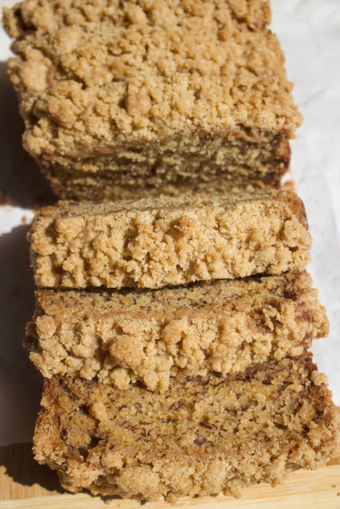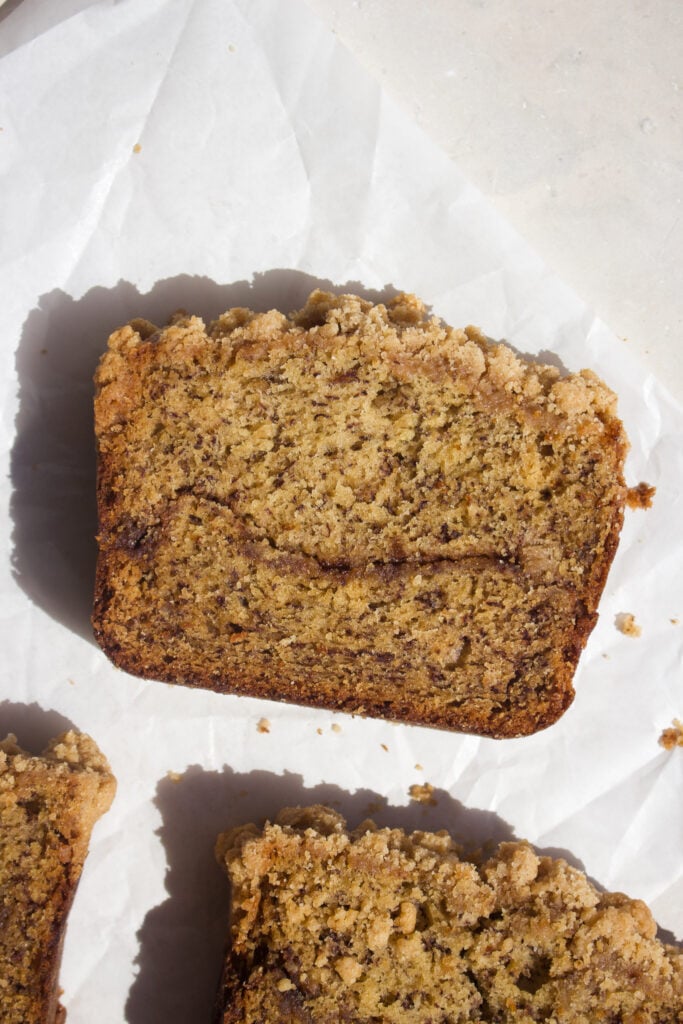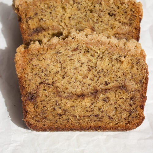This cinnamon coffee cake banana bread is a delicious cross between classic banana bread and cinnamon coffee cake. It’s super moist with a tender banana base and is layered with a cinnamon sugar swirl and rich buttery streusel. Every bite is soft, sweet, and warmly spiced. If you have overripe bananas on your counter, this easy banana bread recipe is a must bake!
