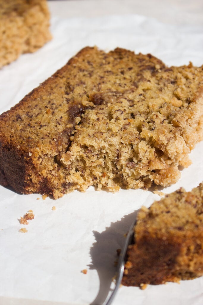 Luckily this banana bread stays soft for days if stored correctly! It's best enjoyed within the first few days, but can stay good on the counter for up to 5 days in an airtight container, and in the fridge for up to 1 week.