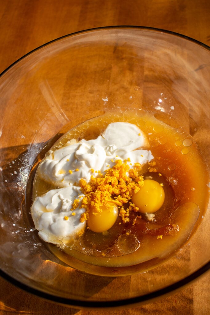 Step 3 - Whisk wet ingredients. Into a bowl, add the brown sugar, oil, orange juice, sour cream, eggs, vanilla, and orange zest. Whisk until well combined (1-2 minutes).