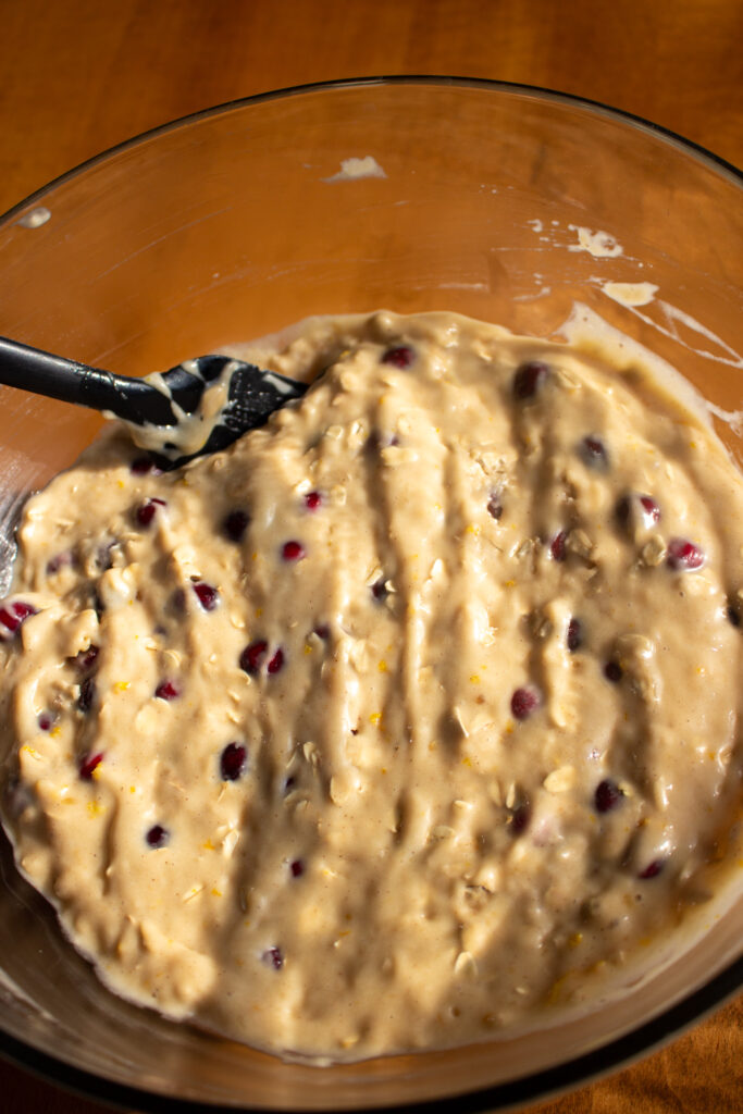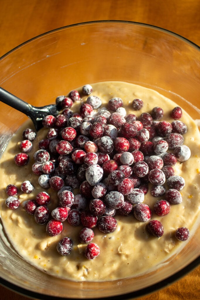 Step 5 - Add cranberries. Toss the cranberries in 1 tsp of flour before adding into the bowl. Then add them into the bowl and gently mix in a few times just until the flour disappears.