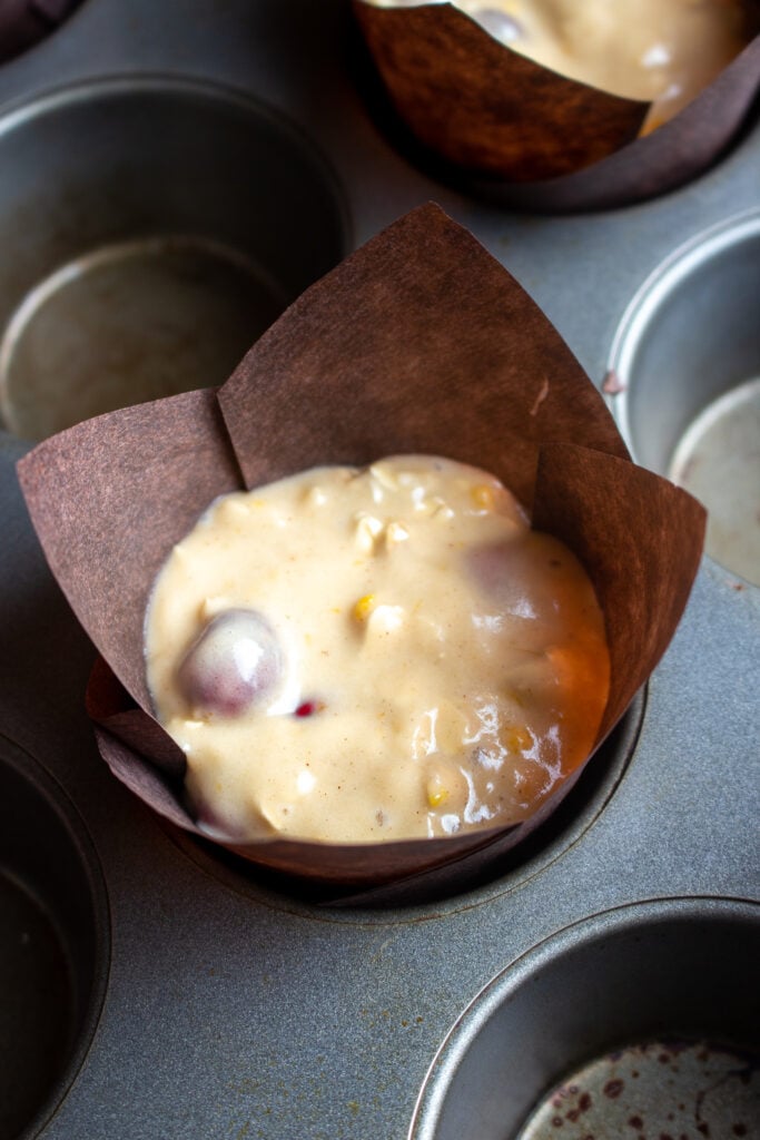 - Evenly divide the batter between the liners. If using regular muffin liners, fill the liners all the way to the top. If using tulip liners, fill them halfway. Then sprinkle a generous amount of streusel on top.