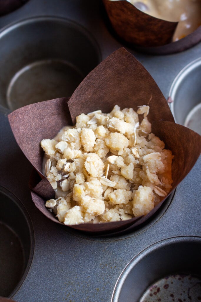Step 6 - Scoop. Fill each liner to the top (or halfway if using tulip liners), and sprinkle a generous amount of streusel on top.