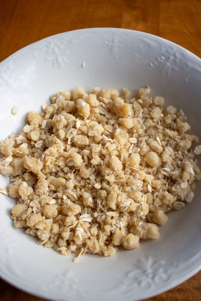 Step 1 – Make the streusel. In a medium sized bowl, add flour, oats, cinnamon, sugar, orange zest, and butter. Using your hands, mix this until crumbly and combined, then set in the fridge to chill.