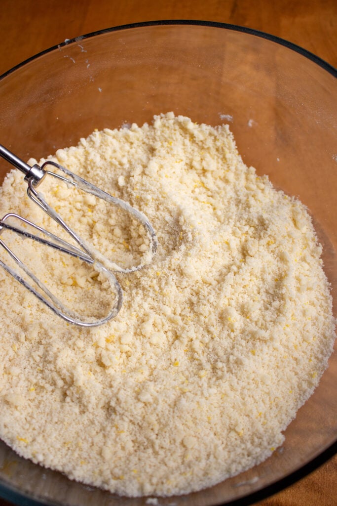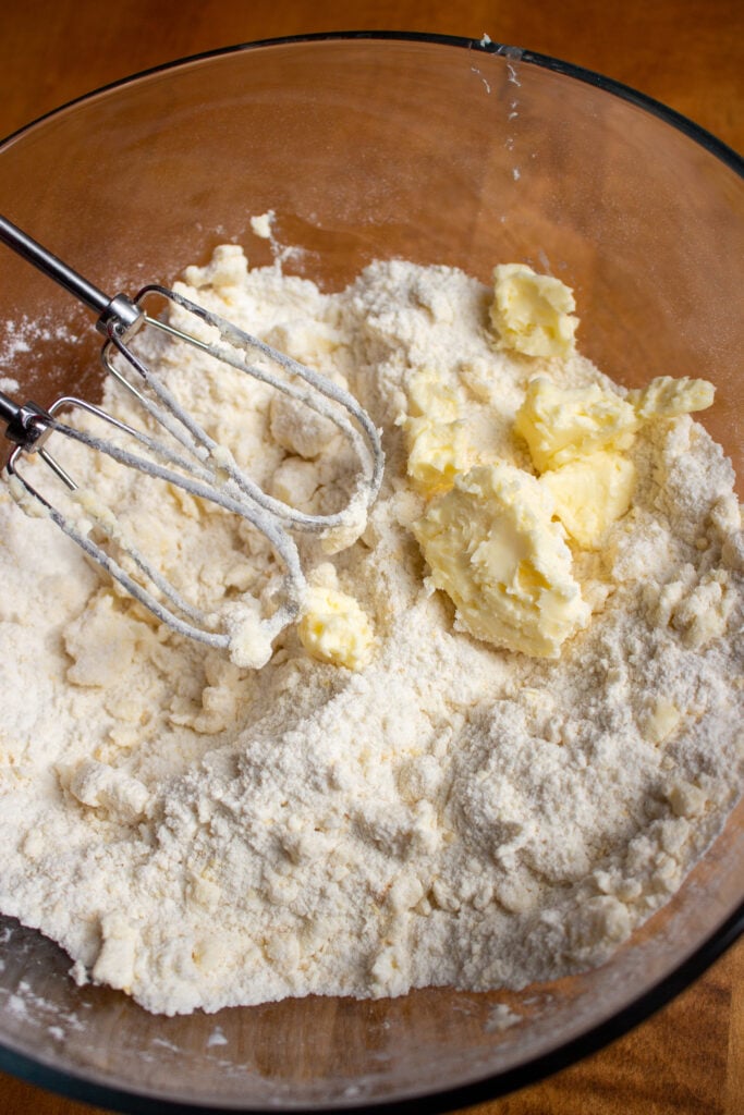 - In the same bowl with the dry ingredients, add in about 1/3 of the butter. Mix on low, and keep adding in the butter until a crumbly texture forms. The key to a tender cake is mixing as little as possible, so only mix until just combined!3/4 cups unsalted butter