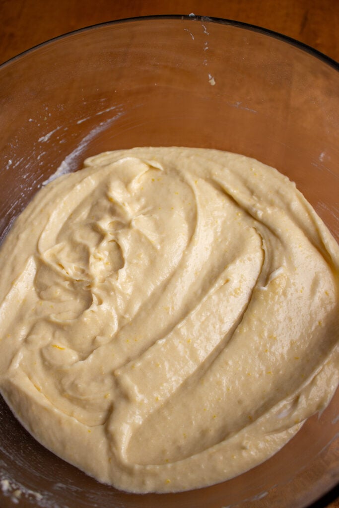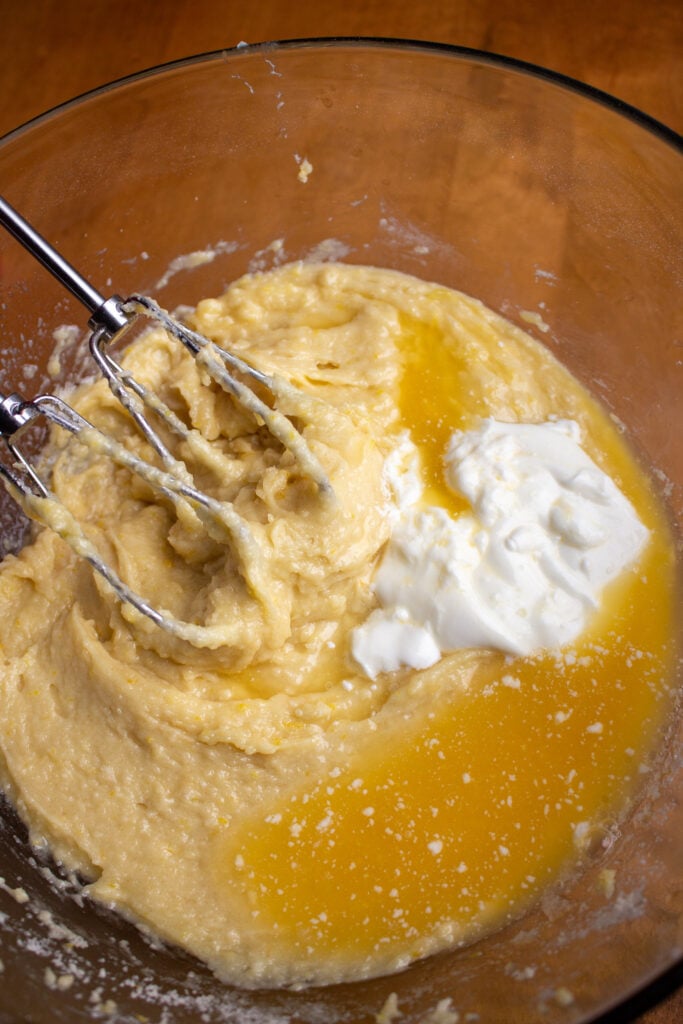 Step 6: Add wet ingredients. Add the eggs in and mix on low speed. Then, add in the vanilla and oil and repeat. Lastly, add the orange juice and sour cream. On low speed, continue mixing until just combined. The batter will be smooth.