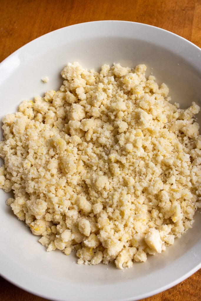 Step 1: Make the streusel. In a bowl, add the softened butter, orange zest, cinnamon, sugar, and flour. Mix together using your fingers or a fork until a streusel forms. Place in the fridge to set as the cake is made.
