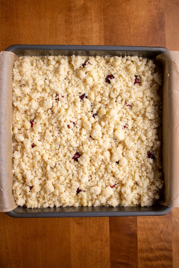 Here is how to make and bake this Cranberry Orange Coffee Cake. You will need a 9×9 pan lined with parchment paper, an electric handheld mixer, three mixing bowls, and a spatula.
