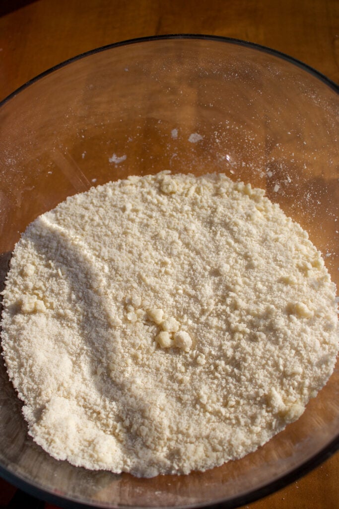 Step 3: Add in butter. Slowly add the butter in on low speed, about 1/3 at a time, until a crumbly texture forms.