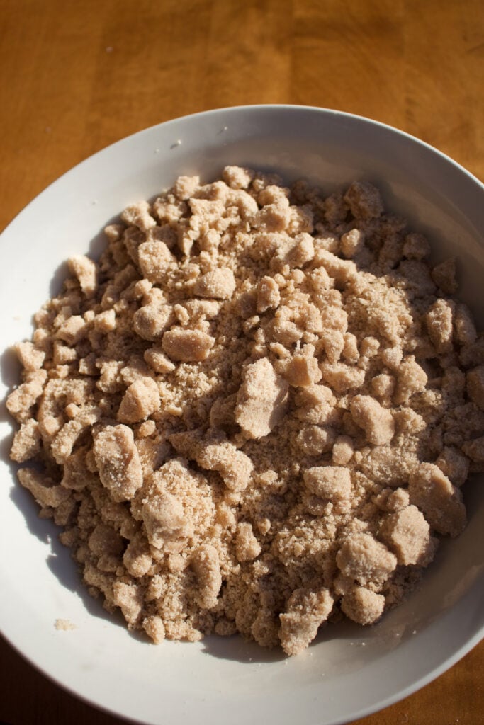 Step 1: Make streusel. In a bowl, add the softened butter, flour, dark brown sugar, white sugar, and cinnamon. With your hands or a fork, mix until a crumbly streusel forms. Then place it into the fridge.
