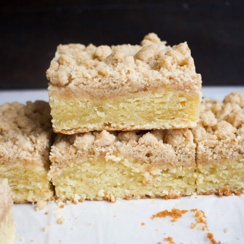 Both cakes are super similar. Coffee cakes typically have layers in between of cinnamon streusel. Crumb cakes typically have a thicker layer of streusel on top! Both equally as delicious. If you're looking for an easy coffee cake recipe, try my Brown Butter Coffee Cake.