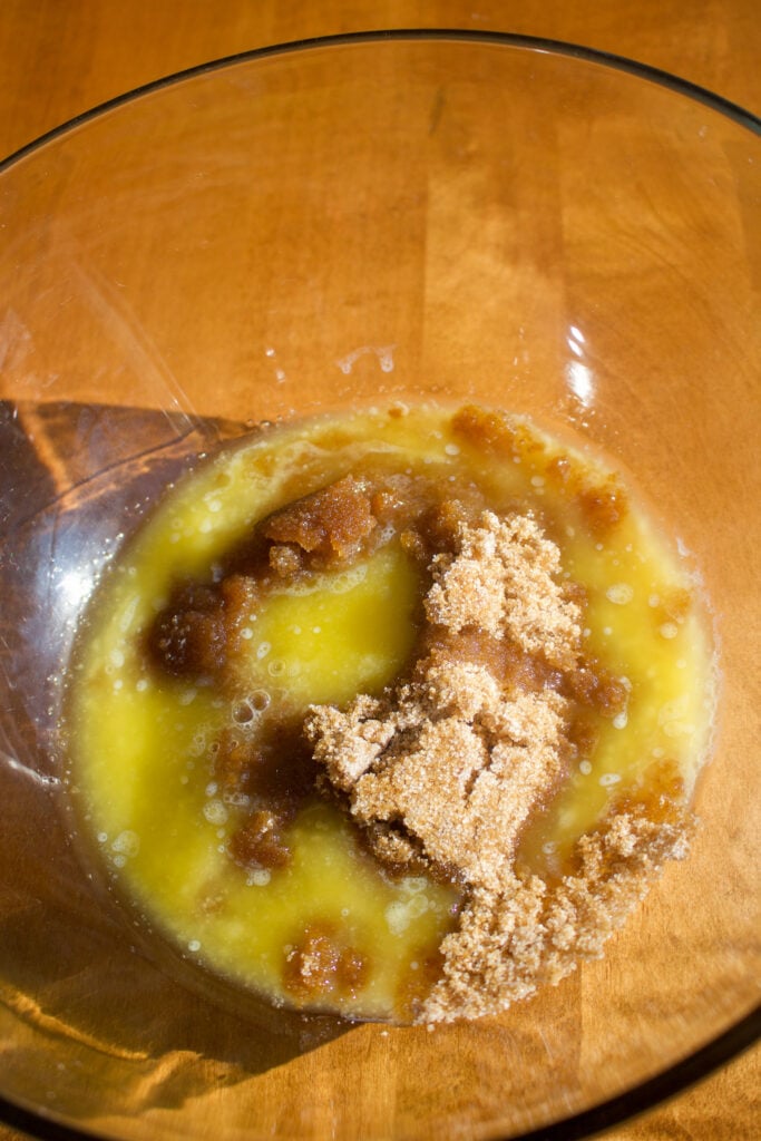 Step 2: Whisk butter and sugars. In a large bowl, add the melted butter, brown sugar, and white sugar. Whisk until well combined (1-2 minutes).