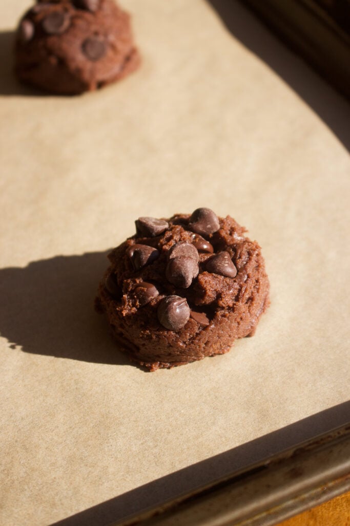 - Scoop 6 cookies per tray, spacing them evenly apart from one another. I used 2 tbsp per cookie. Add extra chocolate chips on top if needed.