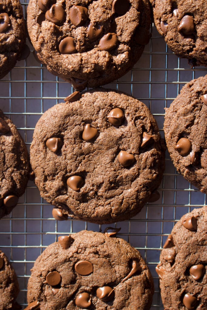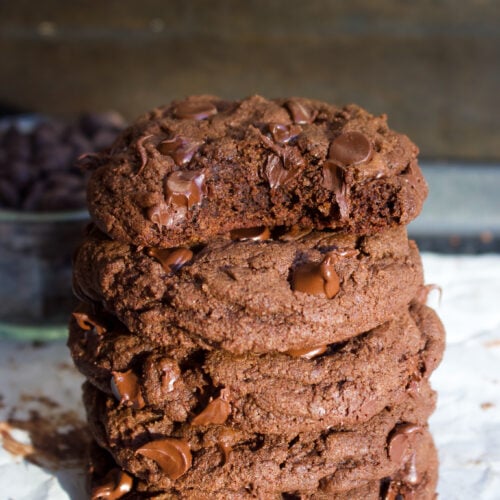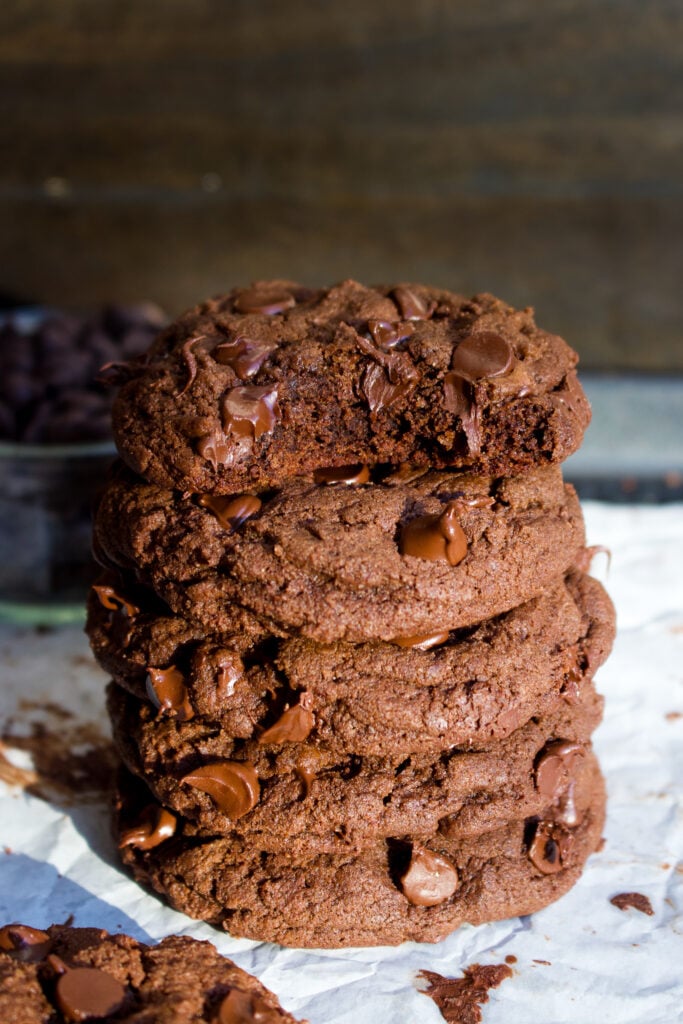 These are soft-baked, thick double chocolate chip cookies made for anyone who believes there is no such thing as too much chocolate. They are so rich and gooey! Made with cocoa powder and loaded with melty chocolate, they deliver deep, fudgy flavors in every bite.