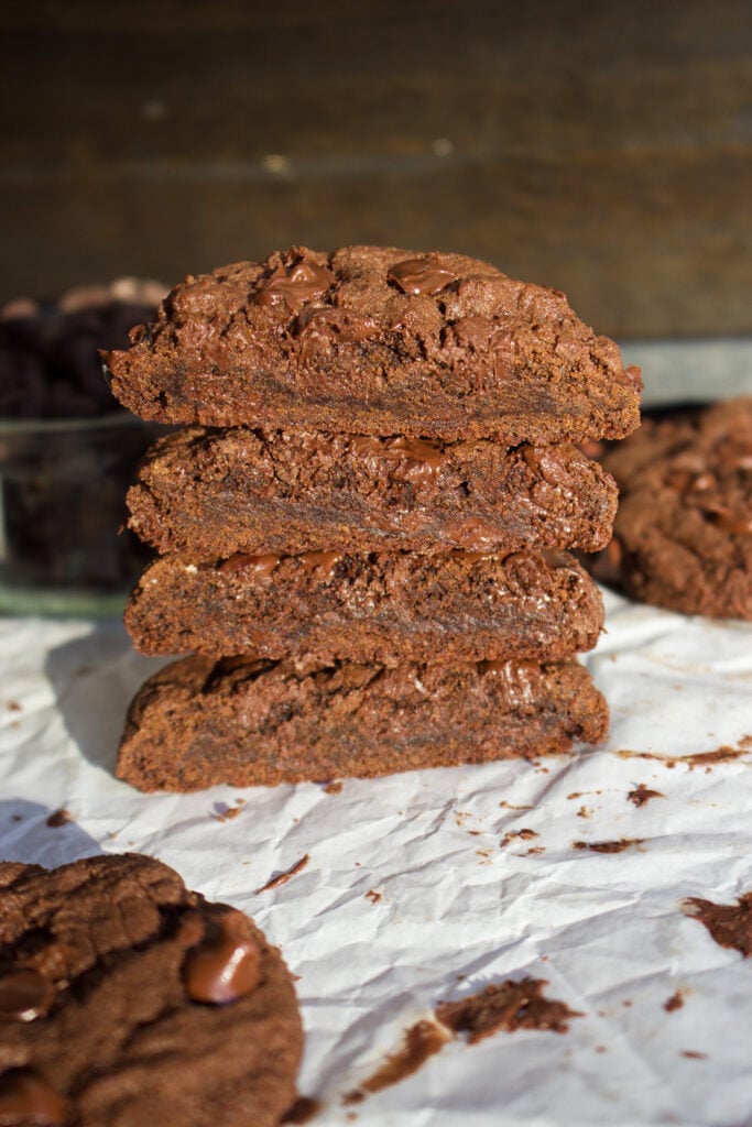 My biggest tip for bakery-style cookies is to use high quality cocoa powder and chocolate chips, it makes all the difference. These cookies stay soft for days, making them ideal for bake-ahead desserts or storing them for dessert throughout the week.
