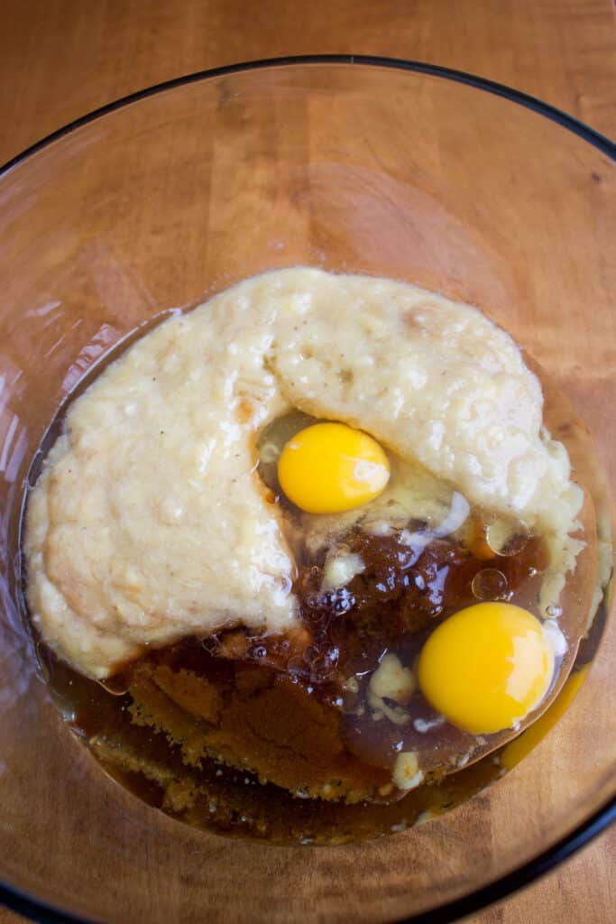 - In a large bowl, add the ripe bananas, brown sugar, eggs, oil, and vanilla. Whisk to combine.1 1/2 cups ripe bananas, 2/3 cups oil, 3/4 cups dark brown sugar, 2 large eggs, 1 tbsp vanilla